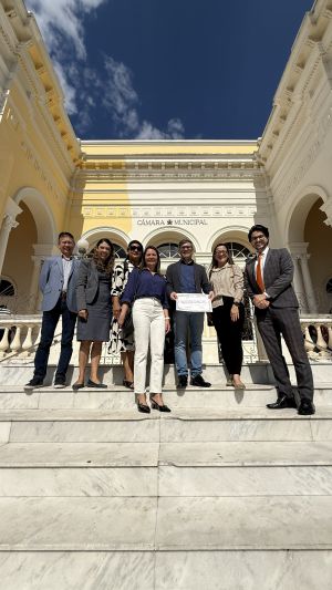 Da esquerda pra direita estão, Rui Suzuki, associado da empresa Central Server e diretor suplente da Subseção Curitiba; a vereadora, Indiara Barbosa; Karyn Amoedo, relações Governamentais e Institucionais do Icities; Daniella Wodonis, Executiva da Assespro-PR; Adriano Krzyuy, Diretor Presidente da Assespro-PR; Rosangela Caetano, Administrativo da Assespro-PR; e o vereador, Rodrigo Marcial